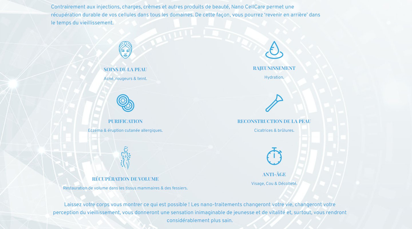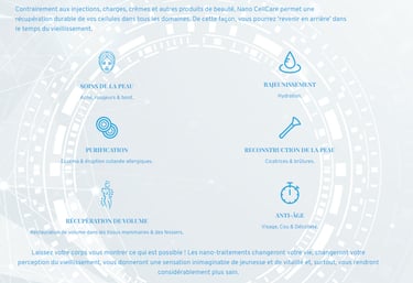 Nous n'utilisons pas d'aiguilles, de pilules ou de crèmes pour améliorer votre peau. La nanothérapie garantit que les substances actives telles que l'acide hyaluronique sont réduites au niveau nano (20 nm à 400 nm). Ces particules sont si petites qu’elles peuvent être transportées à travers les couches cutanées. Au lieu de « plâtrer » temporairement votre peau en remplissant la couche supérieure inélastique, la peau elle-même s’améliorera et retrouvera son élasticité d’origine. Avant tout traitement, il est nécessaire que la peau soit propre, dénuée de tout produit tels que les crèmes hydratantes, le maquillage ...